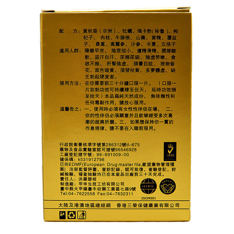 【主要成份】黄秋葵(非洲)、牡、玛卡粉(秘鲁)、枸杞子、肉桂、牛滕根、山蕖、黄精、覆盆子、桑葚、高丽参、沙参、半夏、五倍子等。